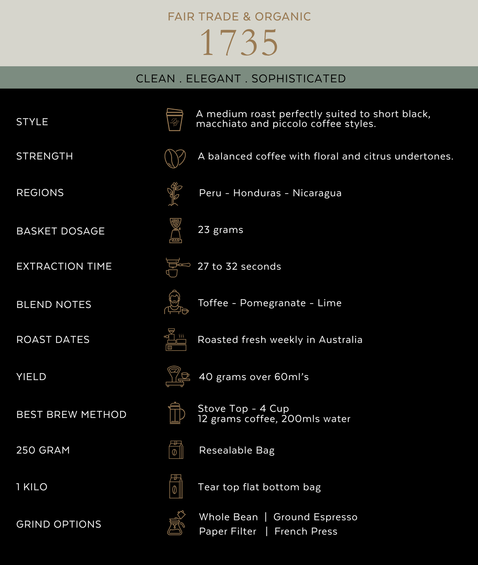 Our 1735 Organic Coffee Beans 250g are a medium roast blend from the growing regions of Peru, Honduras and Nicaragua. Expertly curated to produce balanced tasting notes of toffee, pomegranate and lime. Simply enjoy these organic coffee beans in a more intense coffee either an espresso, short black, macchiato or piccolo style coffee.